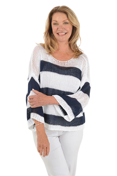 This is a perfect example of an everyday look with a stylish twist. The blue gradient effect of the top paired with the tailored pull-on white pant makes for an elevated ensemble. Add a classic blue denim jacket to stay warm when the temperature drops!